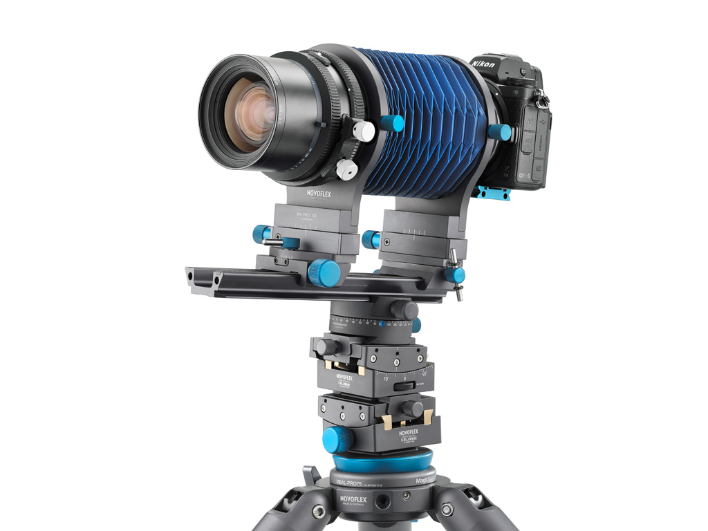 with Panorama Base The Goniometer Head QUBE by NOVOFLEX redefines the concept of a tripod head by combining precision adjustment with modularity. It enables the accurate alignment of SLR and mirrorless cameras, technical cameras, bellows devices, complex macro setups, binoculars, telescopes, and rangefinders.