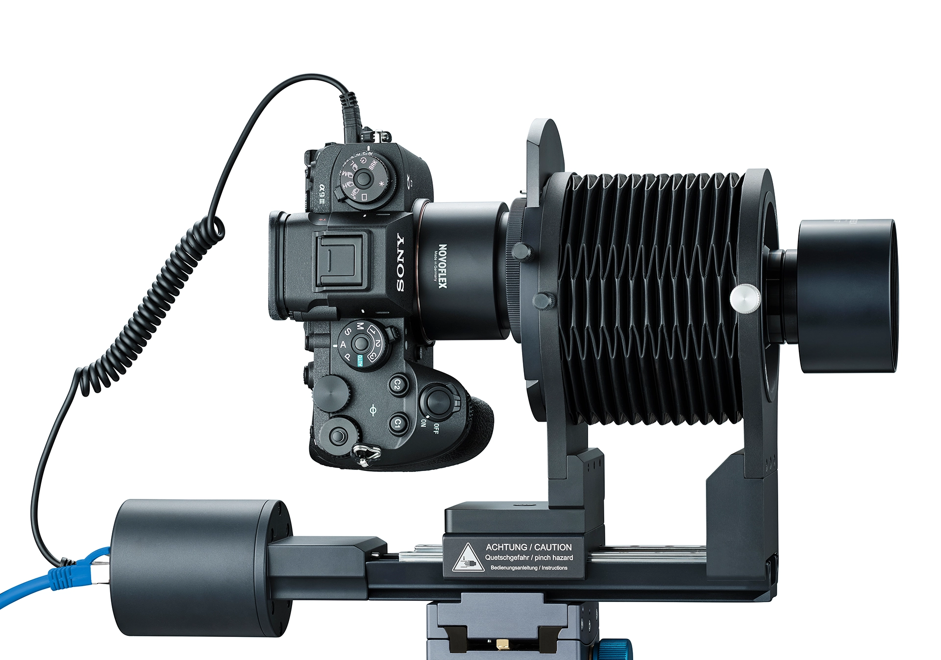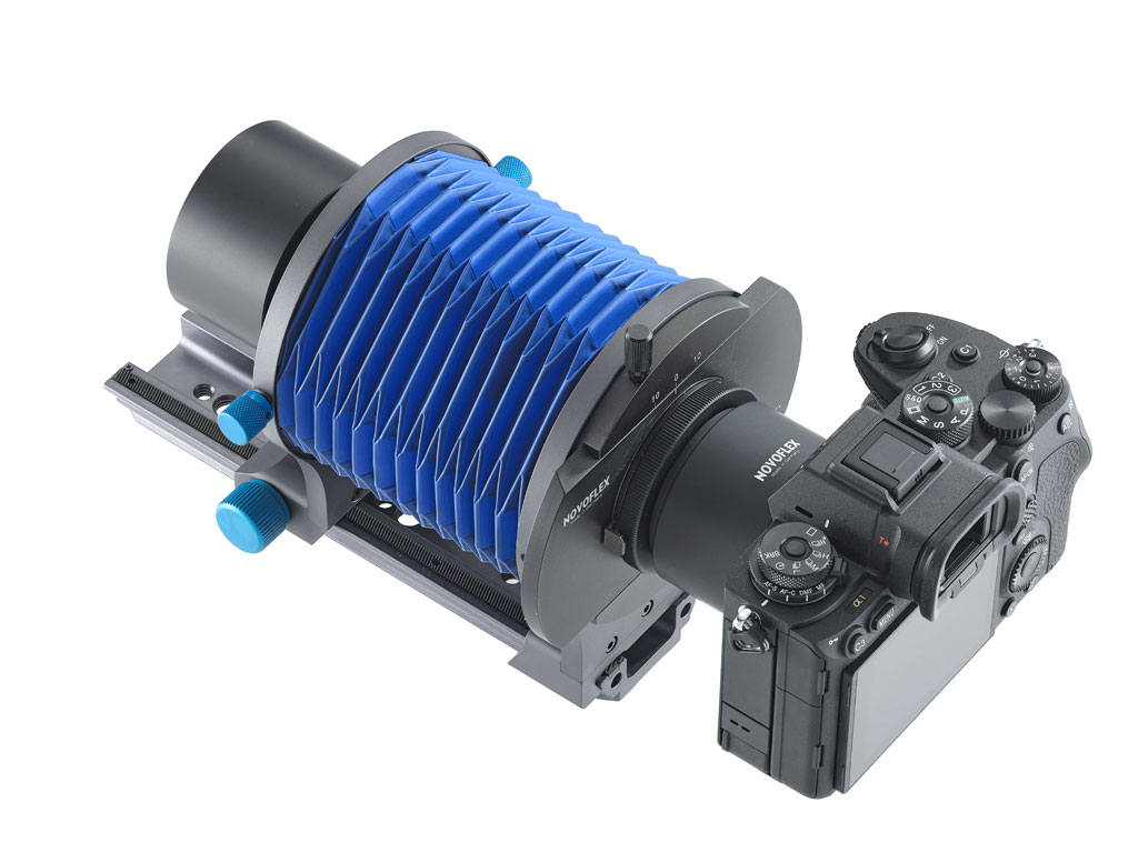 The interchangeable NOVOFLEX A‑mount adapter system ensures compatibility with all common camera models up to full‑frame format and guarantees long‑term flexibility even when changing camera systems.