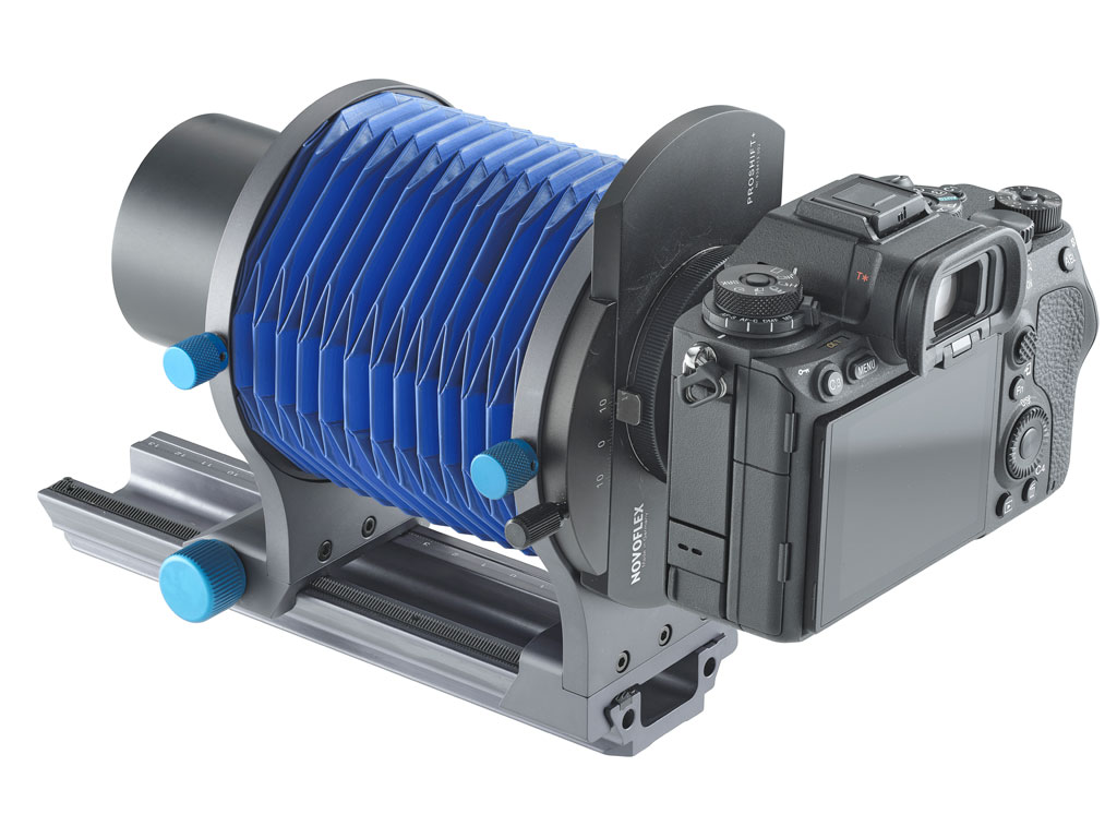 The NOVOFLEX PROshift+ adapter expands your NOVOFLEX bellows unit with a precise parallel shift function. By shifting the camera multiple times and taking two or three exposures, the resulting individual images can be automatically combined into one high-resolution composite using software such as Adobe Photoshop (Photomerge) or similar programs.
