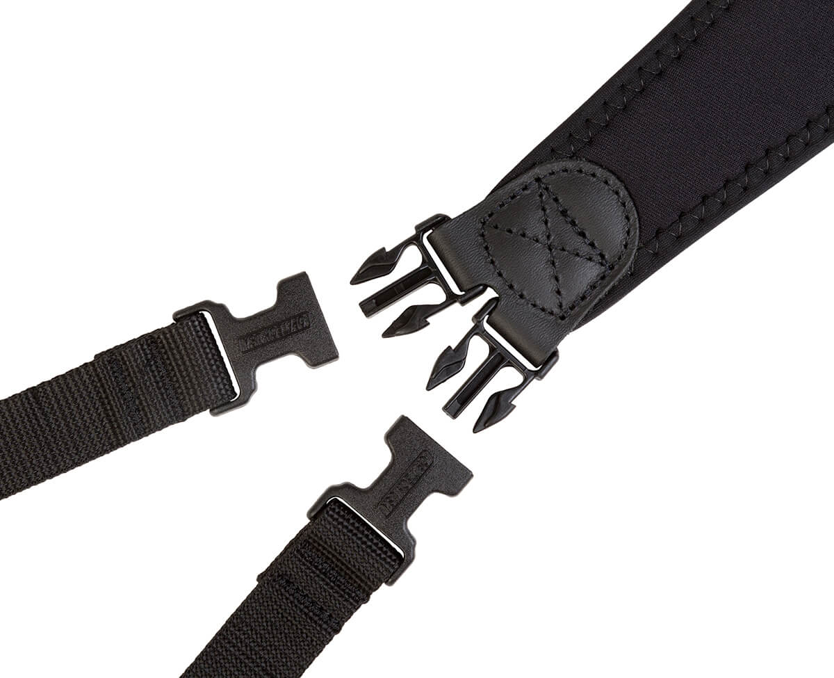 Black The Utility Sling - Duo offers rapid access to two pieces of gear while maintaining the security of a strap worn across a single shoulder. The Utility Sling - Duo comes with four Uni-Loop Connectors. Most cameras will only need one Uni-Loop, but for cameras with a third strap-connection point located on the battery grip, the second Uni-Loop Connector (included) will be used. If only one camera is needed for an outing, the Quick Disconnects allow you to remove one of the slings quickly and easily. The Utility Sling - Duo is fully adjustable from 26.5" - 31" (67,3 cm - 78,7 cm) on each side, measured from the top of the shoulder to the end of the Uni-Loop connector.